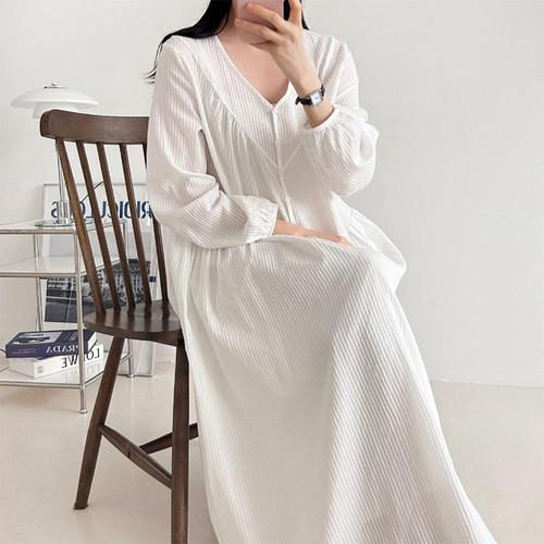 |CSO596E|여성용 봄철 스트라이프 브이넥 퍼프소매 박시 롱드레스