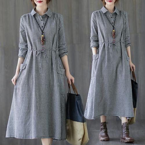 F07613 루즈핏 앞단추 카라 체크 긴팔 롱원피스 WFL8DLY