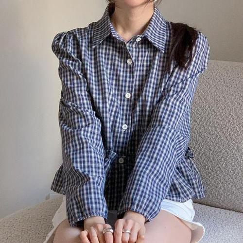 [옷자락]여자 러블리 크롭 린넨남방 프릴 카라넥 체크 블라우스