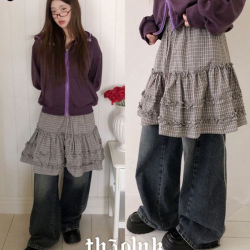 더핑크 / 트룬 밴딩 빈티지 체크 프릴 미니 레이어드 스커트