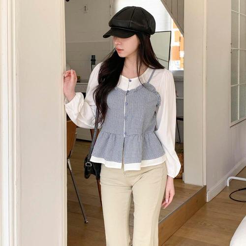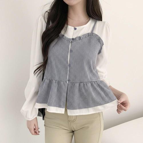 |CHH42B2|여성 체크 패턴 페플럼 뷔스티에 레이어드 블라우스