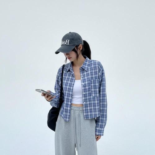 |KSH4253|여성용 봄 크롭 셔츠 체크 패턴 박스핏 개강 스타일 코튼 블라우스