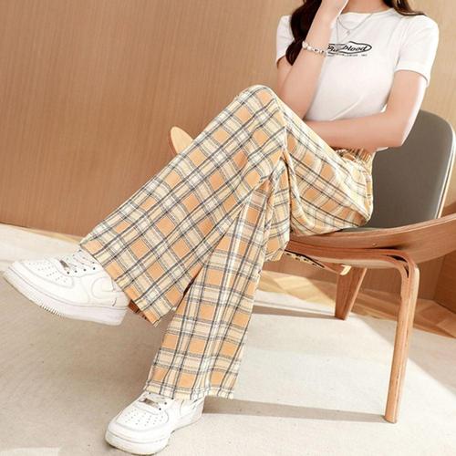 마켓피아 여성용 캐주얼 격자 체크 와이드 팬츠