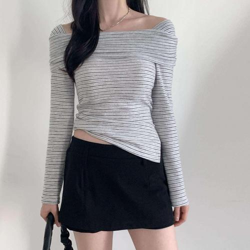 [신상오픈런]여성 힙무드 스트라이프 홀터넥 오프숄더 롱슬리브 니트