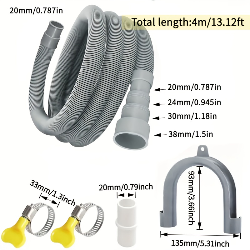 TEMU 2m//4m/5m 범용 세탁기 배수호스 + 연장 어댑터 1개, 클립 2개, U자형 브라켓 1개 포함 - 대부분의 가정용 세탁기와 호환, 20mm/24mm/30mm/38mm 파이프 직경용 리트랙터블 두꺼운 디자인 (트리밍 가능)
