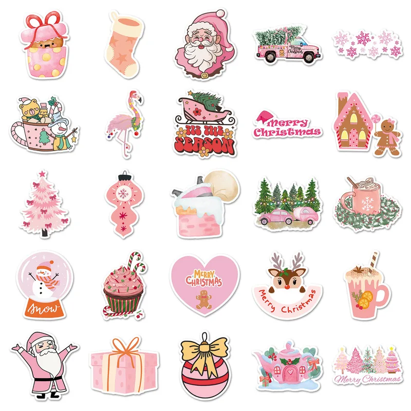 50개의 핑크 크리스마스 만화 이미지 스티커 방수 휴일 장식 DIY 인사말 카드 핸드북 구카 스티커 휴일 선물
