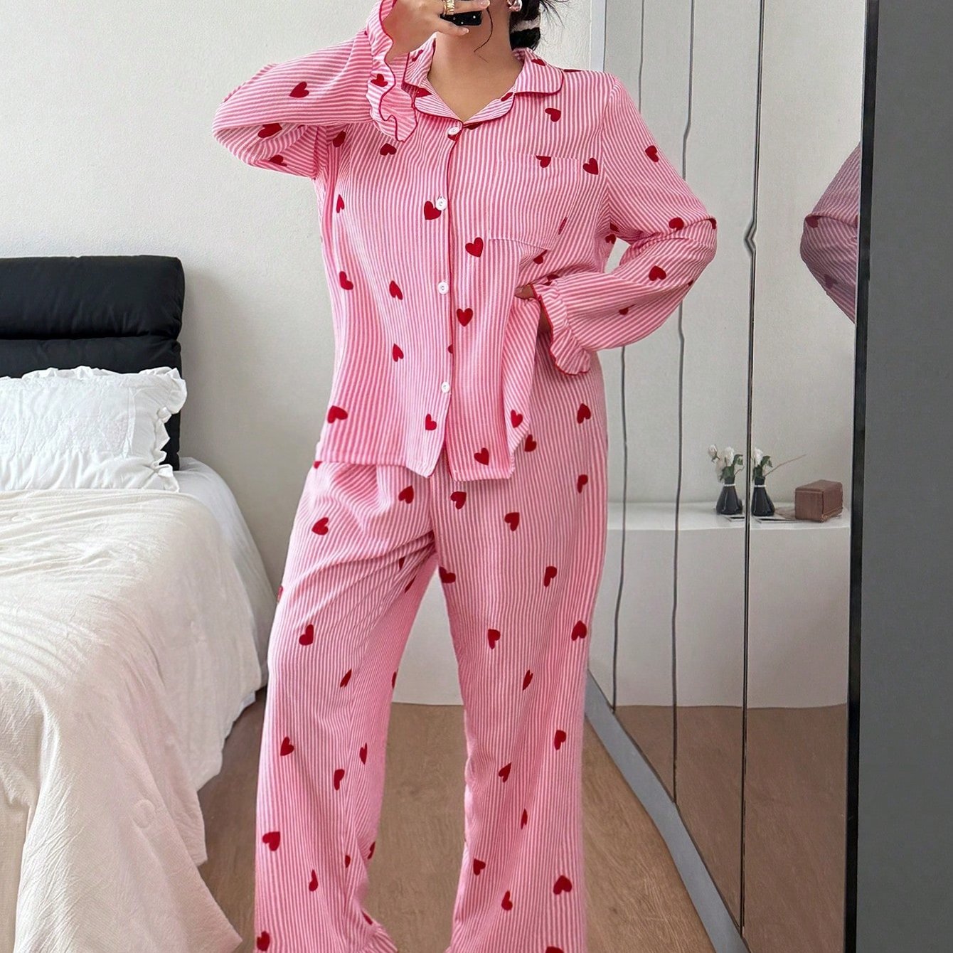 TEMU 2피스 하트 프린트 여성 파자마 세트, 반팔 상의와 바지, 편안한 2피스 하트 프린트 라운지웨어, 라펠과 버튼 트림이 있는 가디건 캐주얼 홈 아웃핏