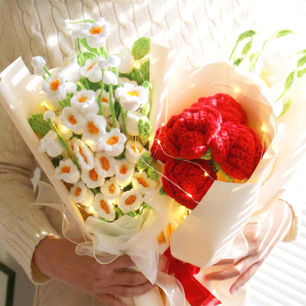 LED전구 증정 수제 뜨개 꽃다발 완제품 부케 결혼 기념일 졸업식 장미 카라 은방울 조화