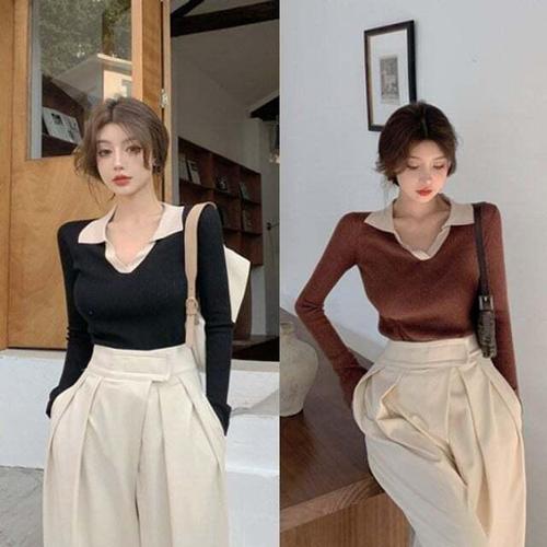 [셀럽하우스]봄 EGOF3941 가을 배색 골지 니트 신축성좋은 슬림핏 카라티
