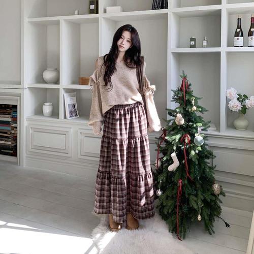 [옷자락]여성 A라인 플레어 클래식 체크 캉캉 롱 원피스