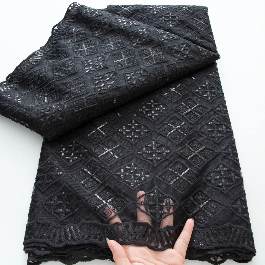 Balck 프랑스어 메쉬 레이스 원단 스팽글 아프리카 웨딩 드레스 A3724에 대한 고품질 나이지리아 프랑스어 수 놓은 얇은 명주 그물 레이스 원단