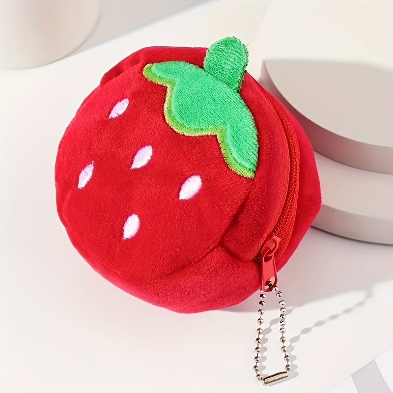 TEMU 세련된 만화 딸기 봉제 동전 지갑 |, 지퍼 잠금, 넥 스트랩 포함, 손세탁 가능