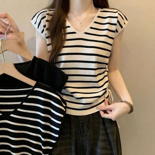 [엄지척]브이넥 깔끔한 스트라이프 패턴 민소매 캐주얼 캡소매_19612669_667501