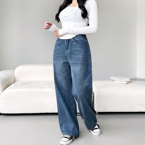 [에이치플러스몰]여성 라네 캣워싱 세미 와이드핏 데님팬츠 롱 청바지