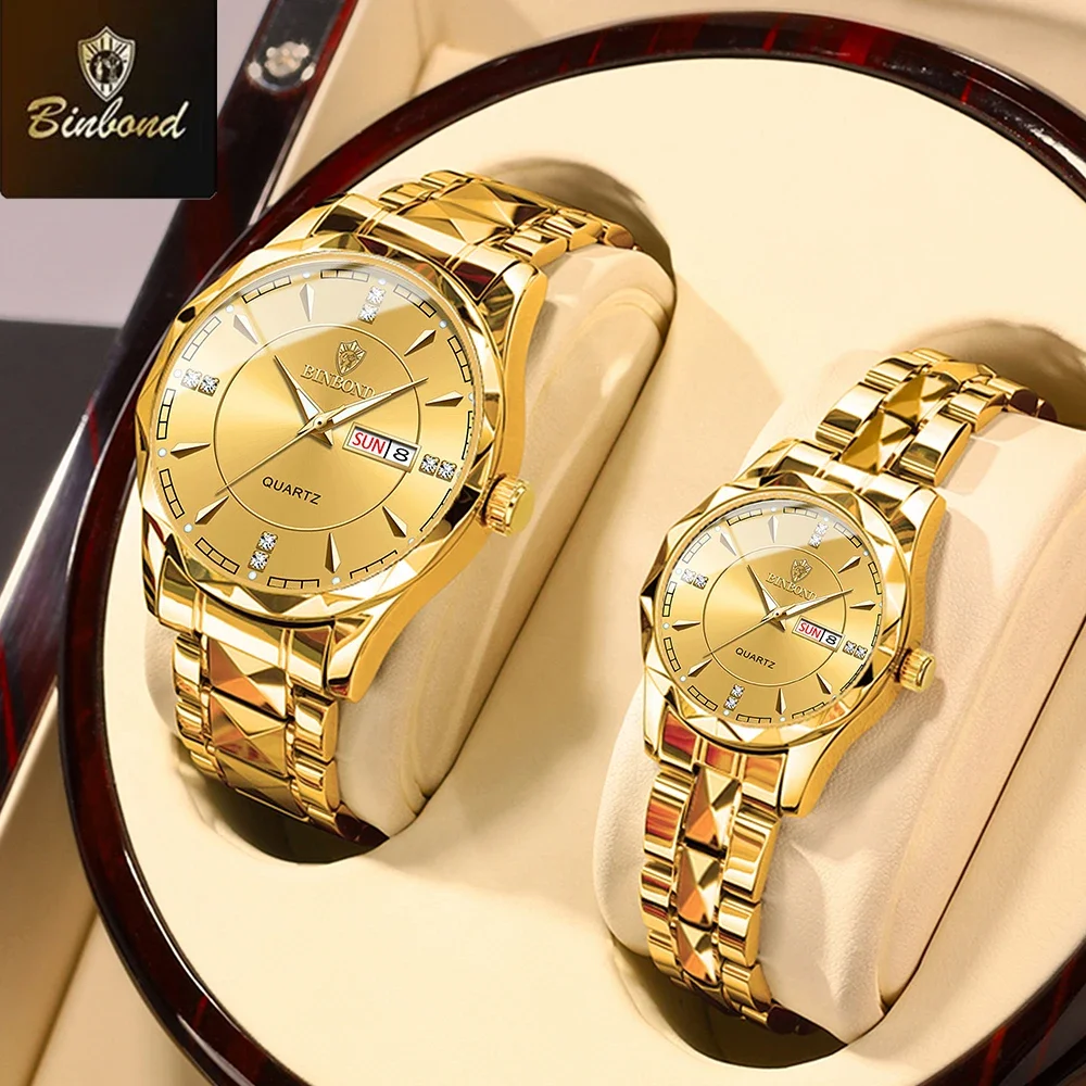 BINBOND 패션 커플 시계 다이아몬드 발렌타인 데이 연인 선물 스테인레스 스틸 방수 시계 남성 여성 쿼츠 시계 2개 세트