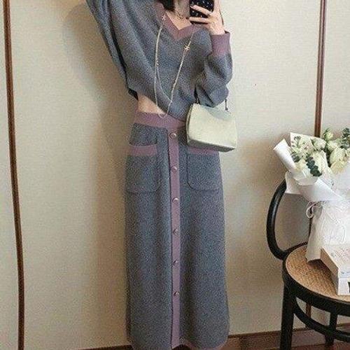 [아리엘스타일]브이넥니트 스커트 코디세트 벨루스투피스