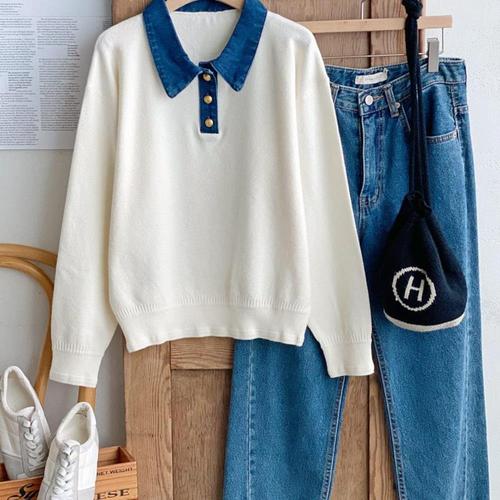 [다잇템]여성 진 스웨터 카라넥 버튼 코디 키치무드