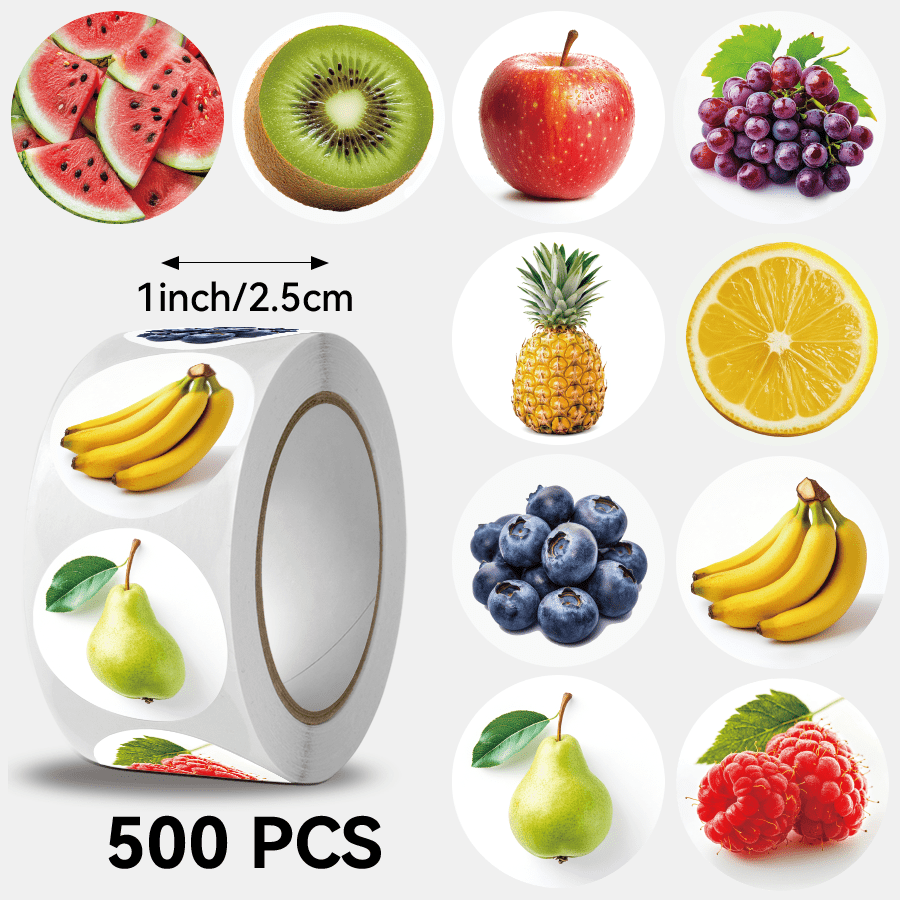 TEMU 500개 과일 스티커 롤 - 50종 이상의 유광 과일 패치 (포도, 딸기, 파인애플, 바나나, 키위) - 공예, 스크랩북, 파티 장식용 원형 종이 시트 & 대량 과일 라벨