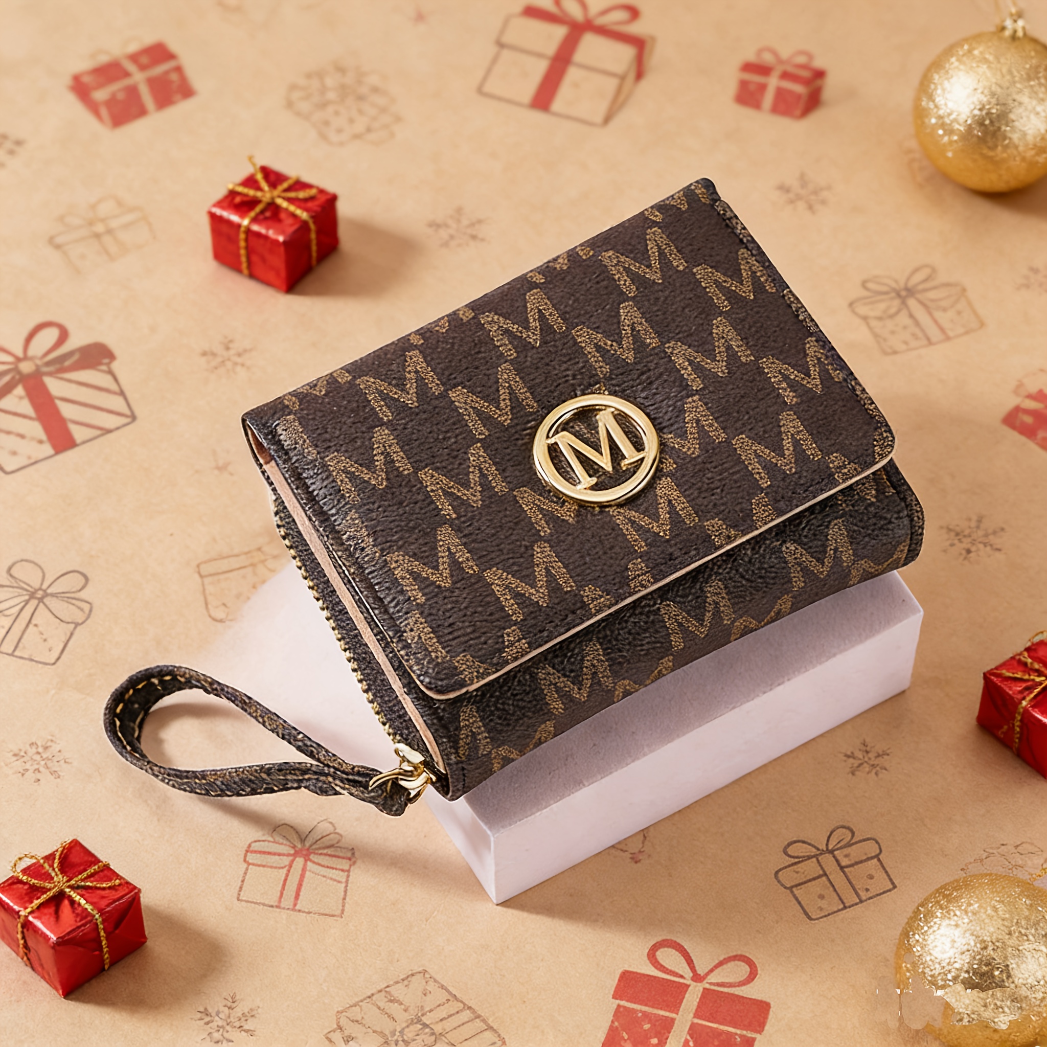 TEMU 여성용 지갑 - 숏 클러치 지갑 - M 레터 프린트 패턴 텍스처 - 코인 포켓이 있는 트라이폴드 지갑, 우아한 데일리 및 포멀 용도 - 유럽 및 미국 스타일 미니 코인 퍼스, 발렌타인데이, 새해 선물, A888 시리즈 신상품