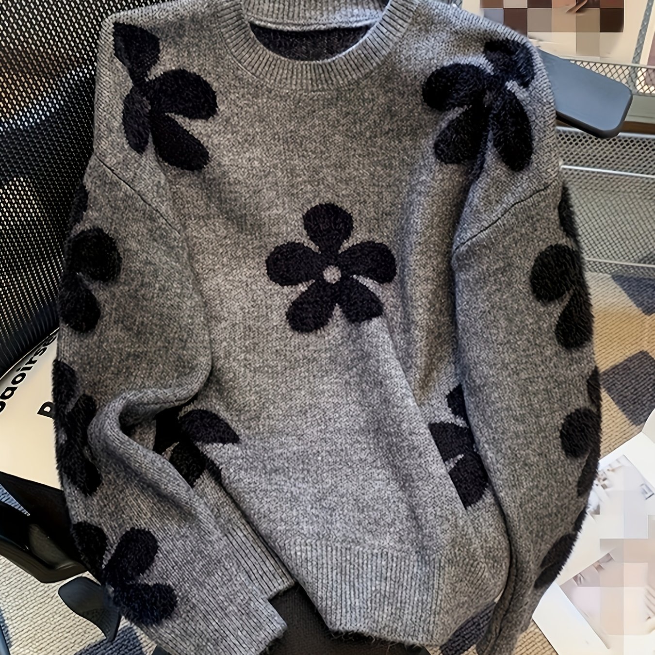 TEMU 여성용 포근한 두꺼운 스웨터 - 긴소매 라운드넥 플로럴 패턴 풀오버, 부드럽고 따뜻한 가을/겨울용 원단, 캐주얼 데일리 & 포멀룩 - 여성 스웨터, 겨울용 스웨터, 겨울 의류, 클래식 니트, 스타일리시 니트
