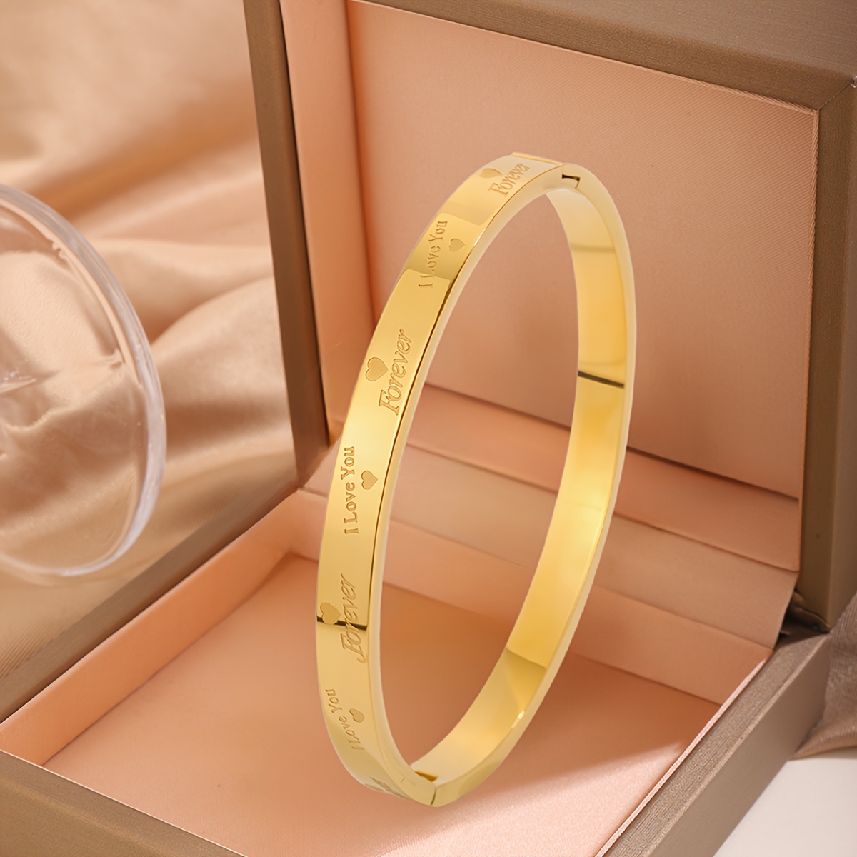 TEMU 남녀공용 우아한 스테인리스 스틸 러브 팔찌 - 골드톤, 하트 조각이 있는 디자인, 일상 착용, 결혼식, 기념일, 발렌타인데이, 추수감사절 및 새해 선물에 완벽함, 웨딩 주얼리 | 우아한 팔찌 | 광택 마감, 귀여운 팔찌