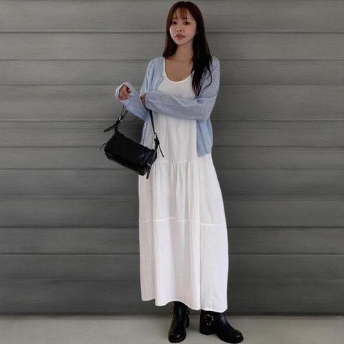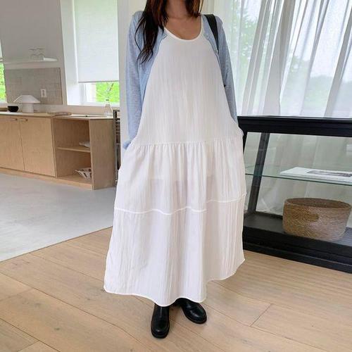 [옷자락] 여성 단색 유넥 쿨링 핀턱 셔링 민소매 롱 드레스