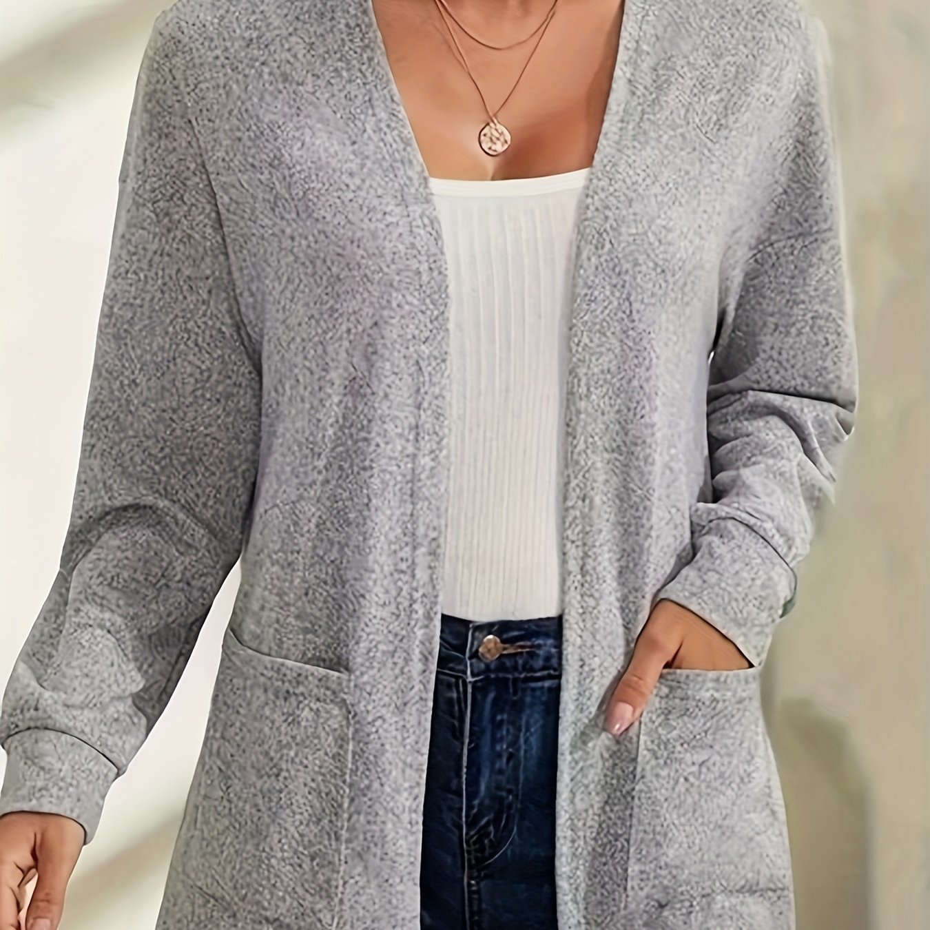 TEMU 단색 오픈 프런트 미디 길이 카디건, 캐주얼 롱슬리브 듀얼 포켓 얇은 카디건 봄 & 가을, 여성 의류