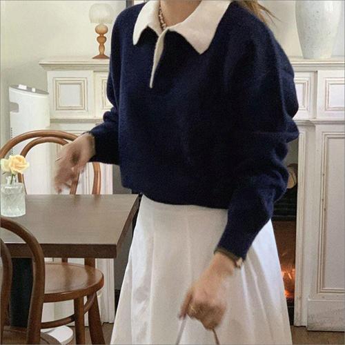 배색 카라 긴팔 니트 여성 세미크롭 포근한 스웨터 2색 WFKN9J3