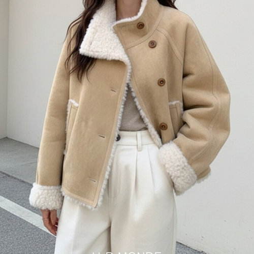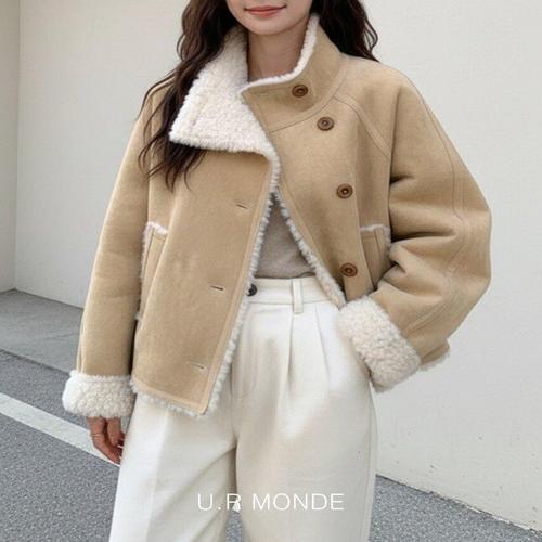 [유아몽드]스웨이드 배색 무스탕 털 안감 베이지 숏자켓 크롭 러