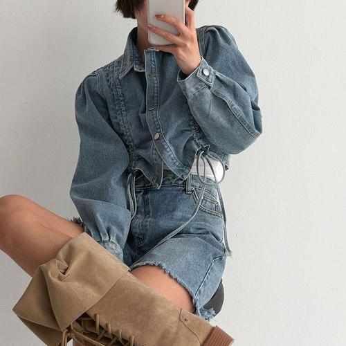 [신상오픈런]여성 퍼프 카라넥 스트링 셔링 크롭 청자켓 봄 투웨이