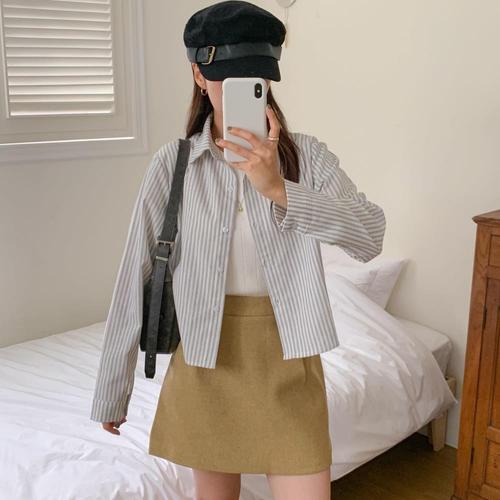 [신상오픈런]여성 스트라이프 카라 긴팔 셔츠 가을용 세미크롭