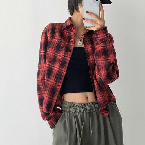 [에이치플러스몰]여성 체크 크롭 루즈핏 긴팔 셔츠 데일리 남방
