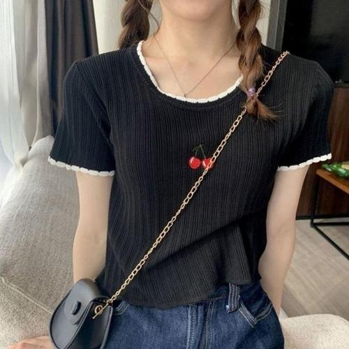 크롭 여름 슬림 골지 반팔티셔츠 니트 데일리룩 WFL6IKQ