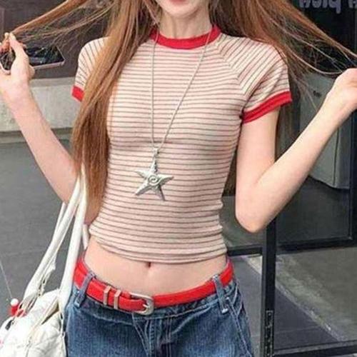 [에이치플러스몰]라운드 크롭티 심플 반팔티셔츠 스트라이프 여성