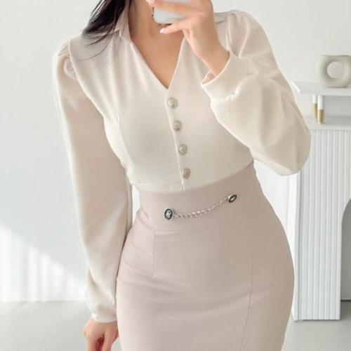 [옷자락] 여성 셔링 브이넥 자른 크롭 가을 퍼프 블라우스