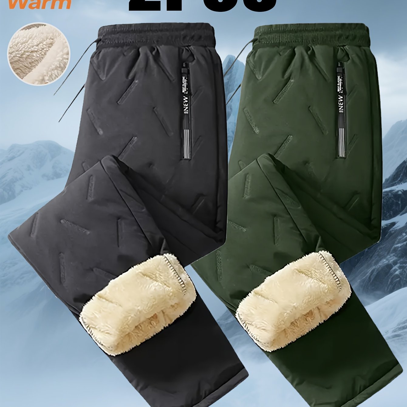 TEMU 남성용 헤비듀티 안감 겨울 바지 2개 - 지퍼 포켓 & 드로스트링 허리, 직다리 디자인의 보온성 강화 바지, 추운 날씨, 야외, 스키용 (세탁기 사용 가능)