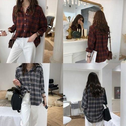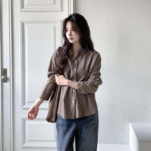 우먼 스프링 오텀 그리드패턴 셔츠 블라우스 심플클래식 탑 WFJIVRJ