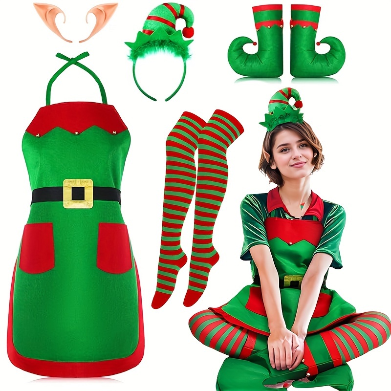TEMU 크리스마스 엘프 의상 액세서리 세트 여성용, 5pcs 파티 의상 키트 앞치마, 엘프 모자, 신발 커버, 줄무늬 레깅스, 엘프 귀, 벨 디테일, 폴리에스터 및 스판덱스 블렌드, 손세탁 - 축제 휴일 파티 웨어