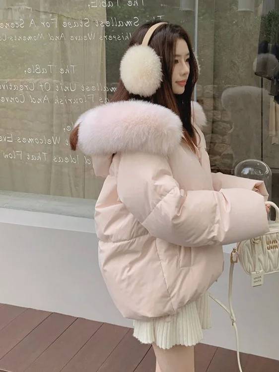 핑크 폭스 퍼 칼라 숏 다운 코튼 재킷 여성용 스몰 사이즈 겨울 브레드 스타일 코트 따뜻한 코튼 의류 코트