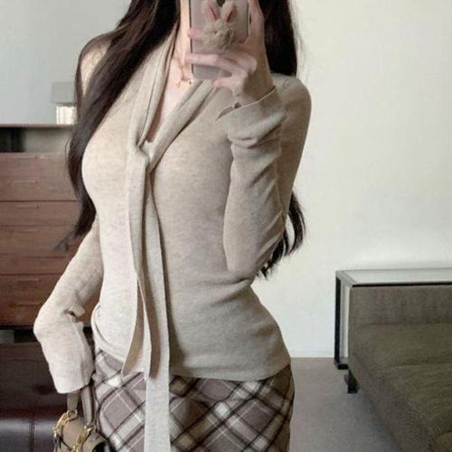 [옷자락] 여성 단가라 스카프 타이넥 여리핏 긴팔 니트