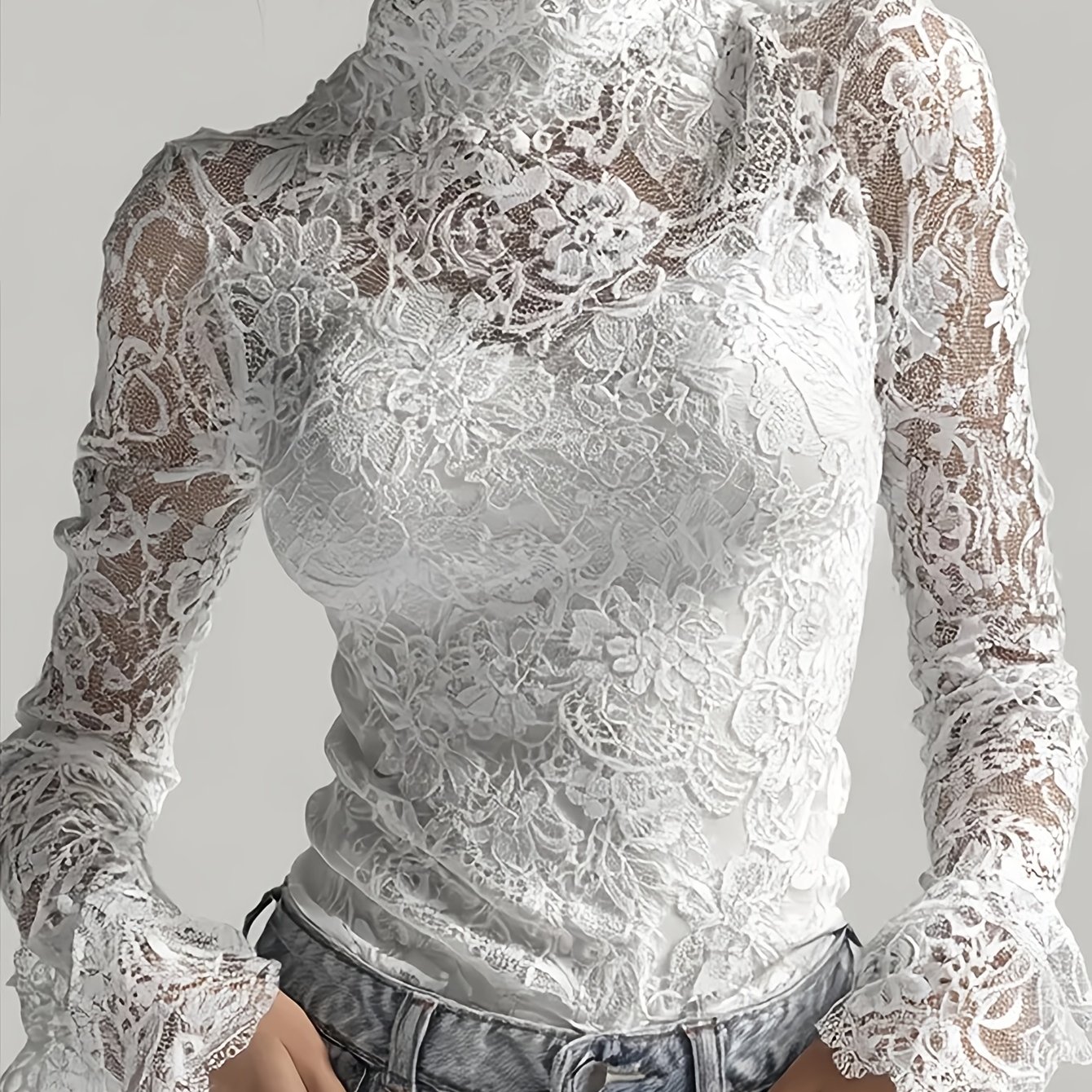 TEMU 하이넥 롱소매 탑, 우아한 성숙한 스타일, 화이트 입체 플라워 레이스 하이넥 플레어 소매 슬림핏 탑과 캐미솔 2피스 세트, 부를 끌어들이는