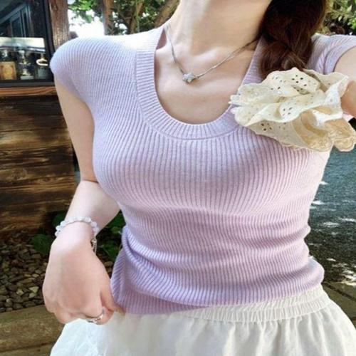 더플로우커머스 여성용 미니멀 골지 라운드넥 크롭 니트 탑