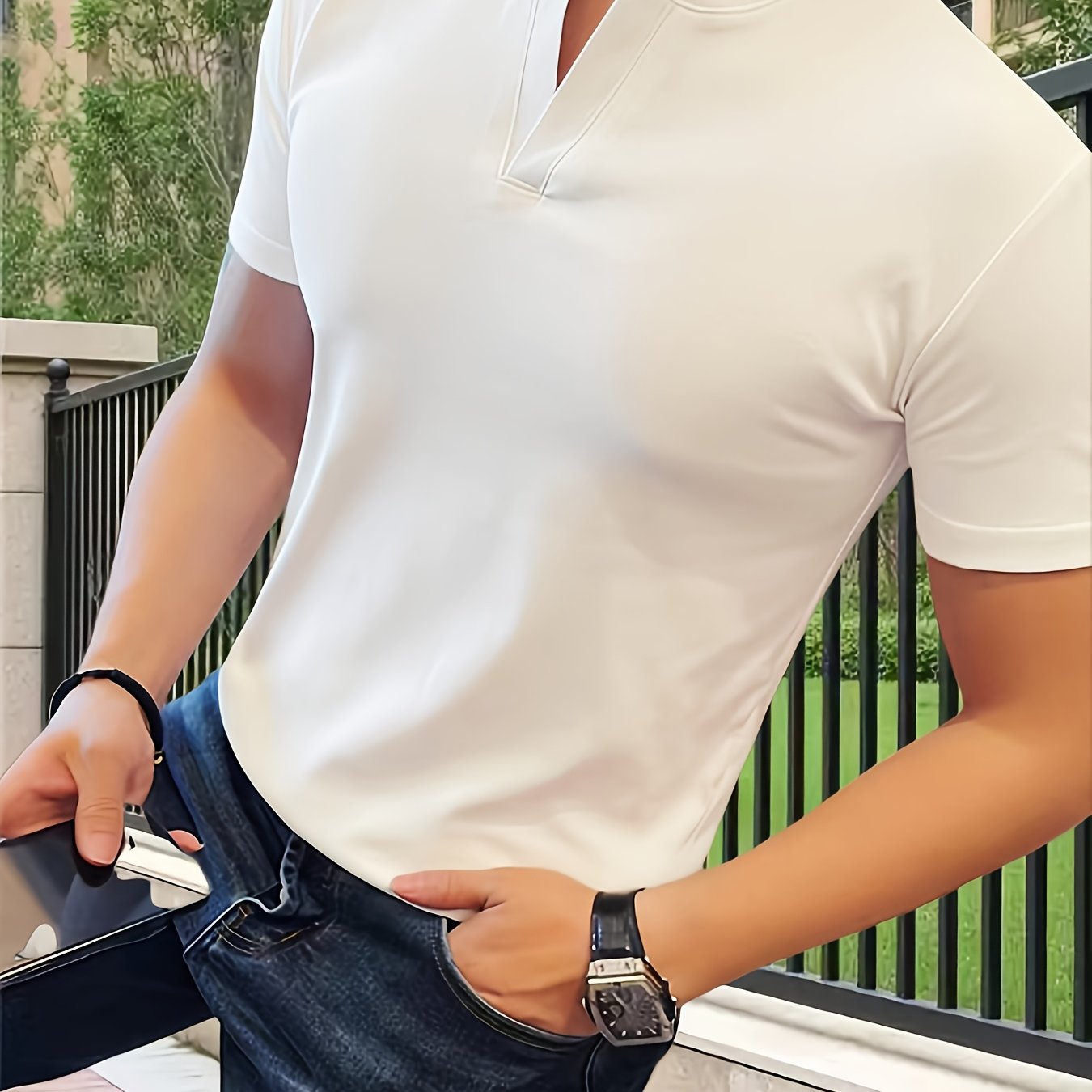TEMU 단색 패셔너블 남성 캐주얼 브이넥 반팔 티셔츠, 업무 및 여행용으로 탁월한 선택