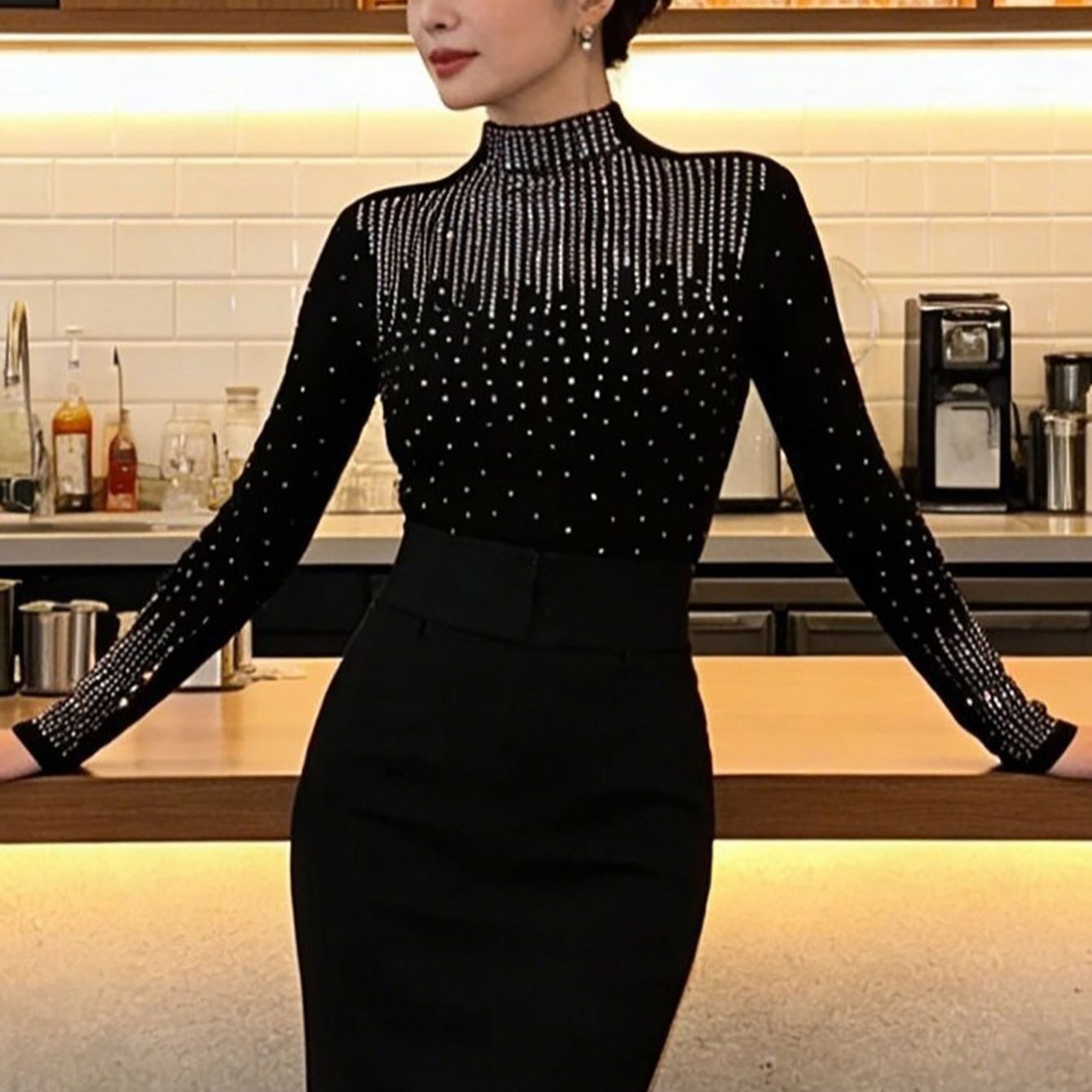 TEMU 여성 봄가을겨울 티셔츠 긴팔 빤짝이 스팽글 큐빅 슬림 하이넥 이너 상의 무용복 엘레강스 패션 슬림소녀 SLIM GIRL