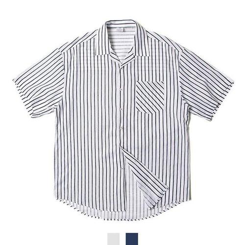 KING 더블 스트라이프 린넨 오픈카라 반팔셔츠 WFKMJBT