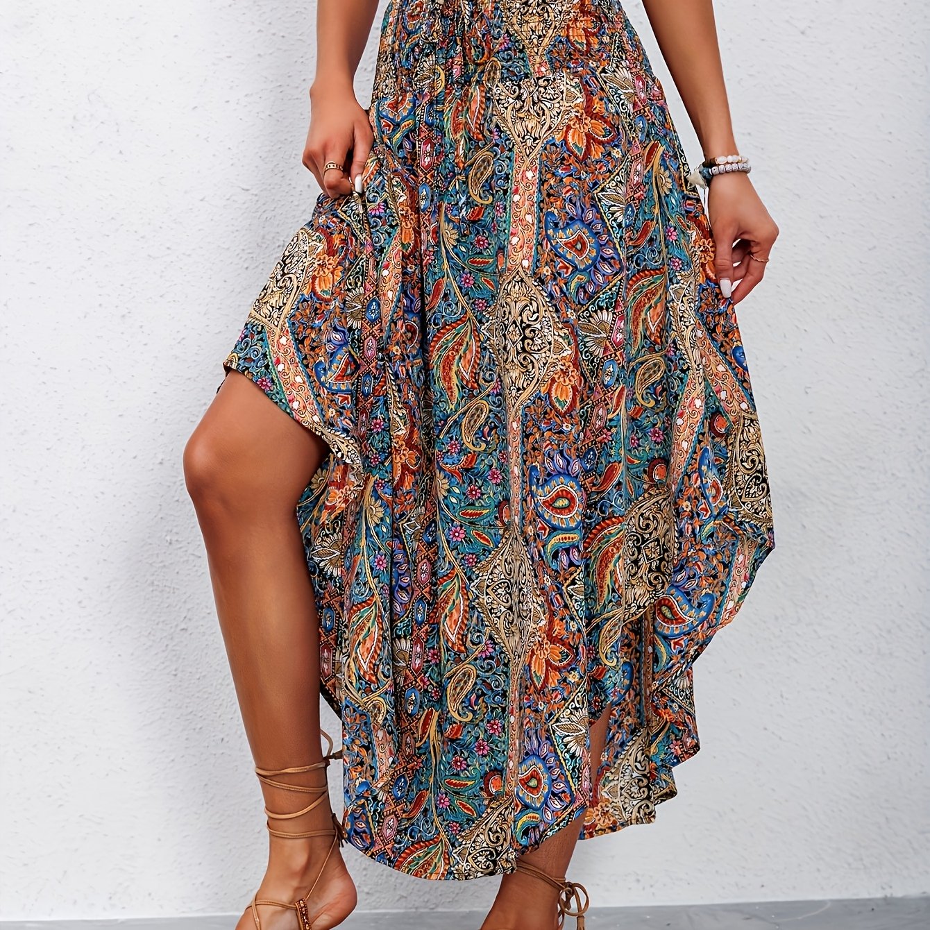 TEMU 새로운 여성 패션 프린트 하이웨이스트 플리츠 캐주얼 스커트, 곡선형 밑단 하프 스커트
