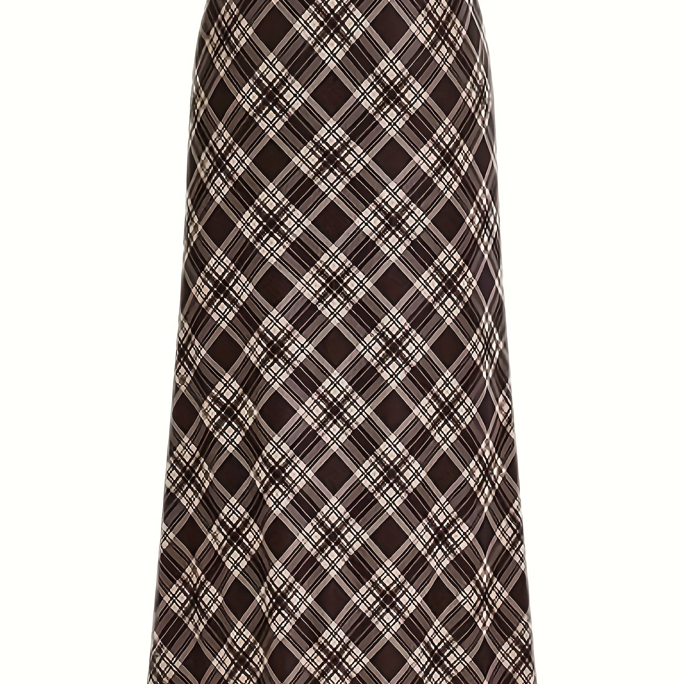 TEMU 우아한 빈티지 브라운 체크 스커트 - 하이웨이스트 미디/롱 길이 H라인 실루엣 우산 밑단 마르모렐 스타일 - 세탁기 사용 가능 사계절용, 세미포멀 & 캐주얼 의상 (브라운 체크)