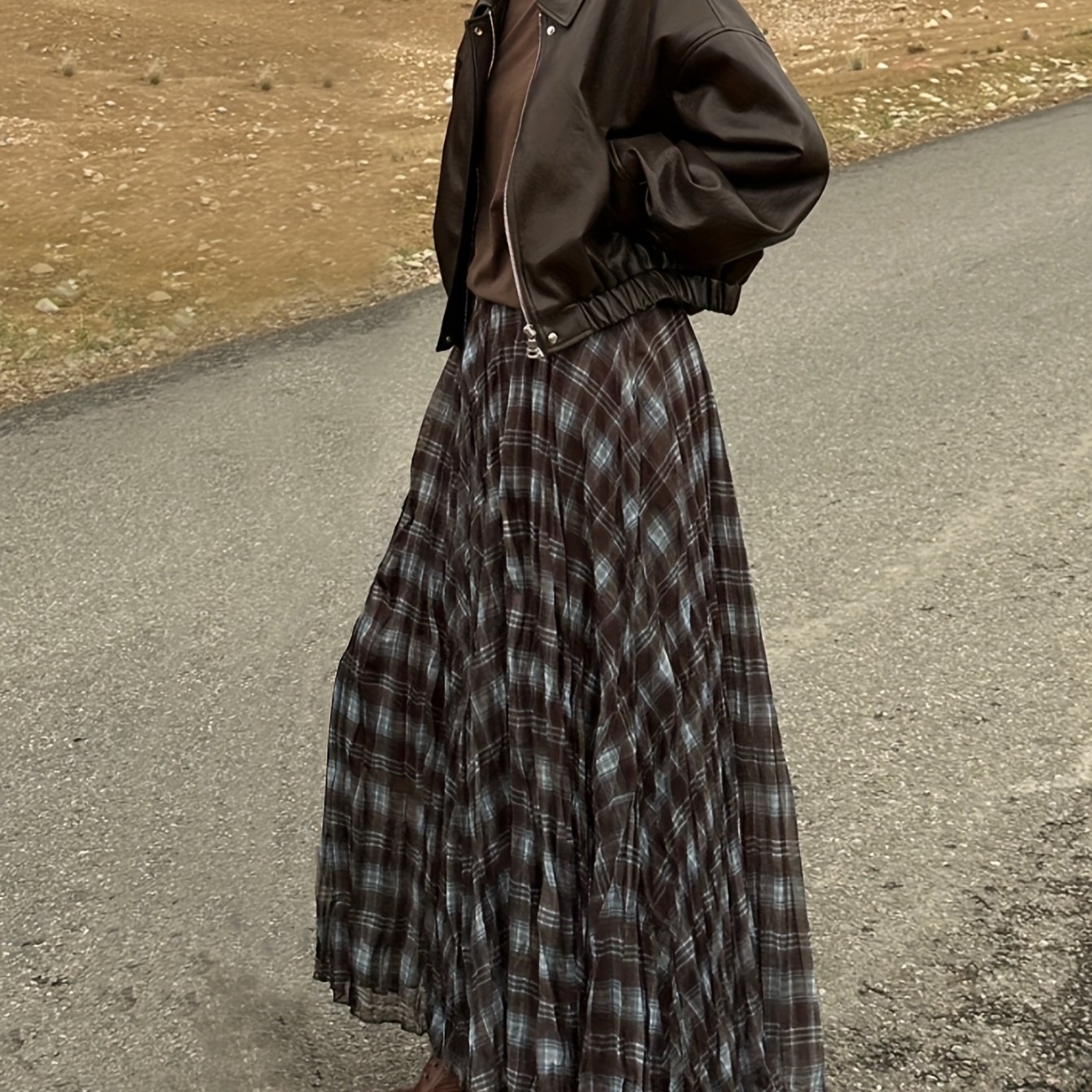 TEMU 신상 가을-겨울 체크 미디 스커트, 툴 맥시 하이웨이스트 우아한 체크 A라인 탄력성 안감 롱 드레스