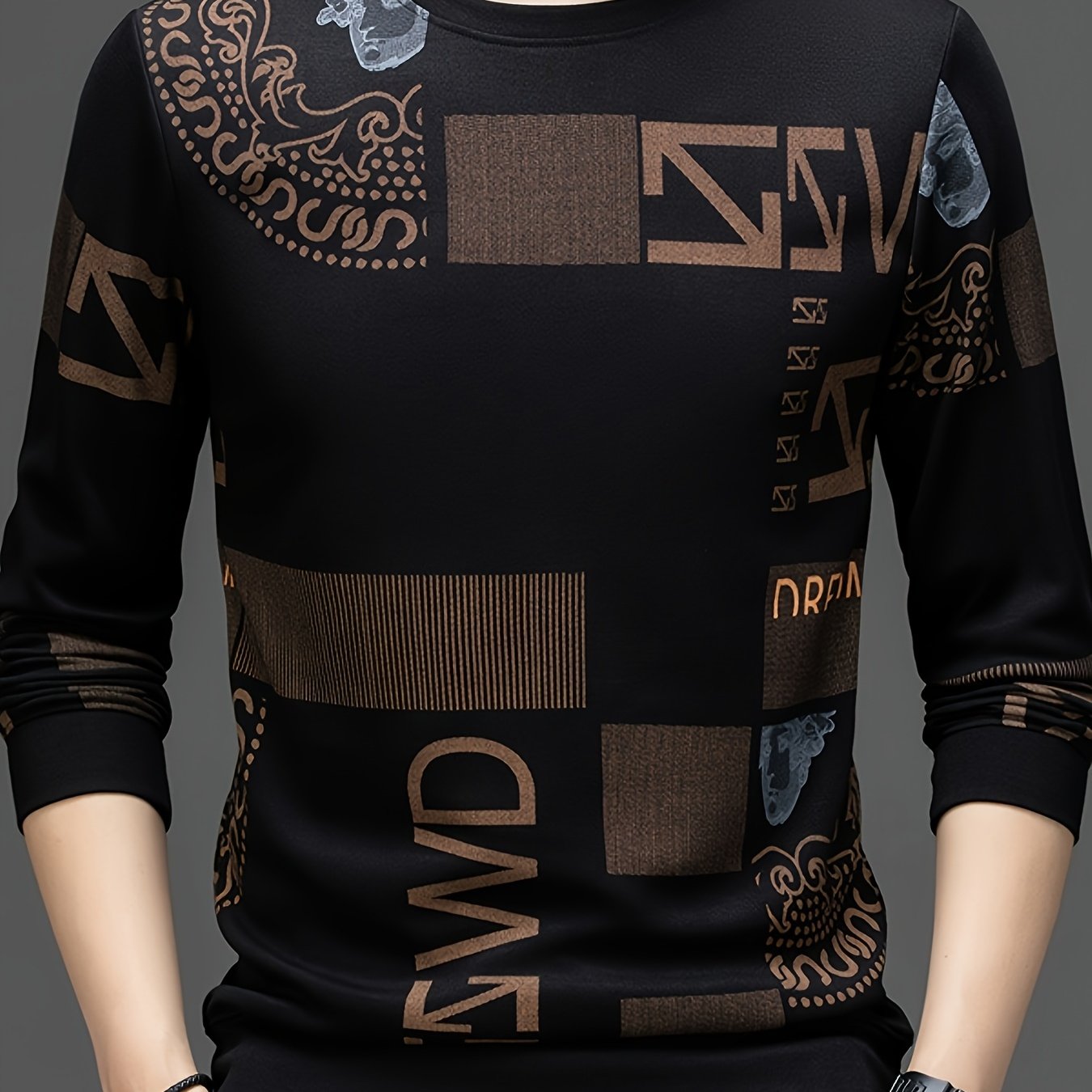 TEMU 남성용 통기성 긴팔 티셔츠 - 부드럽고 신축성 있는 편안한 핏, 크루넥 디자인, 기하학적 화살표 패턴, 모던 아웃도어 스타일, 스포츠 및 캐주얼 웨어|패션