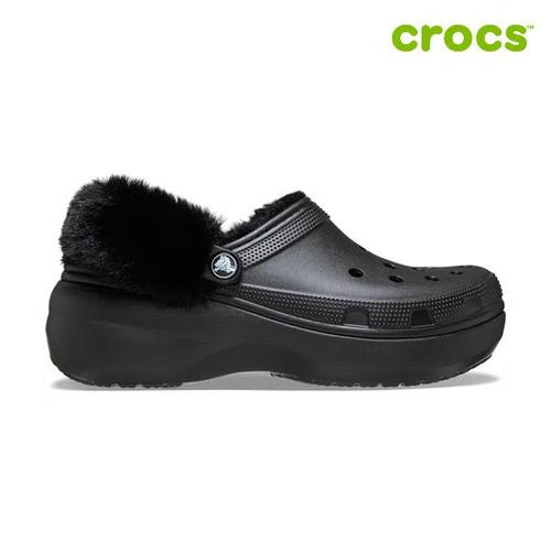 [크록스]클래식 플랫폼 라인드 퍼즈 스트랩 클로그 여성 털샌들 212854-001